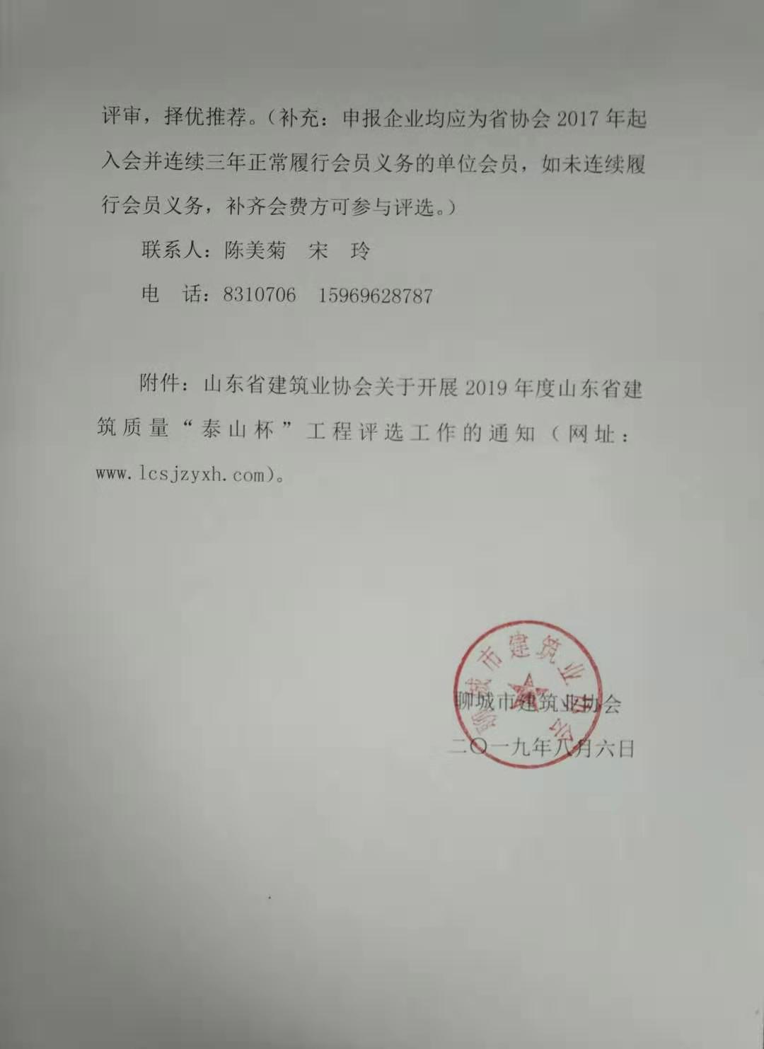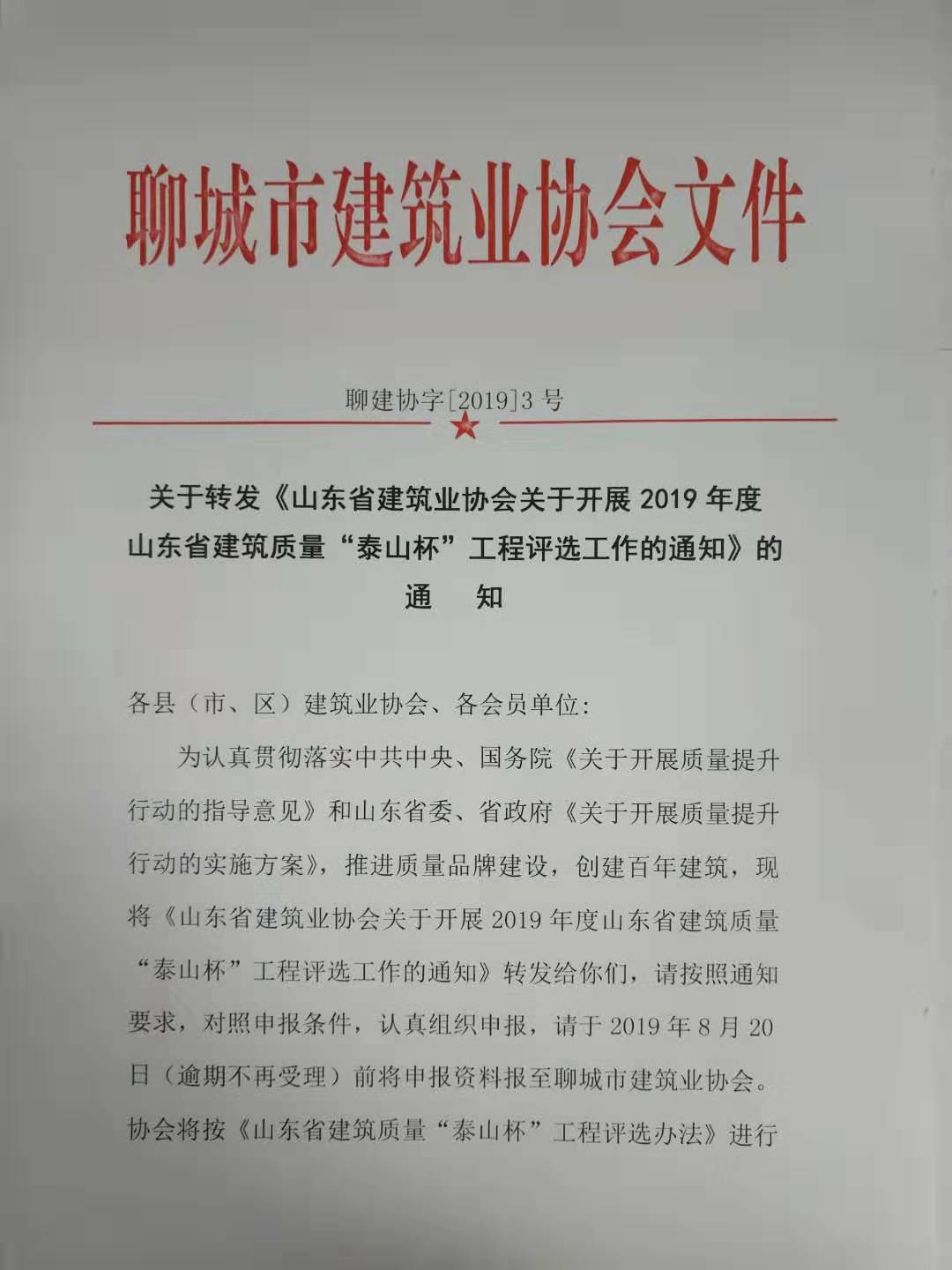 關于轉發(fā)《山東省建筑業(yè)協(xié)會關于開展2019年度 山東省建筑質(zhì)量 “泰山杯”工程評選工作的通知》的通 知
