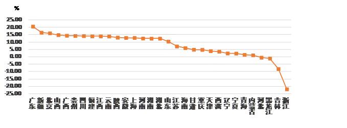 從各地區(qū)建筑業(yè)總產(chǎn)值增長(zhǎng)情況看,有 27 個(gè)地區(qū)的建筑業(yè)總產(chǎn)值較上年同期有不同幅度的增長(zhǎng)。其中,廣東、新疆、北京的增幅均超過(guò) 15%。有 4個(gè)地區(qū)出現(xiàn)負(fù)增長(zhǎng),其中,浙江出現(xiàn)了 超過(guò)20% 的負(fù)增長(zhǎng)(圖 2)。